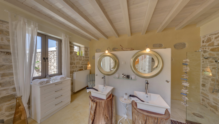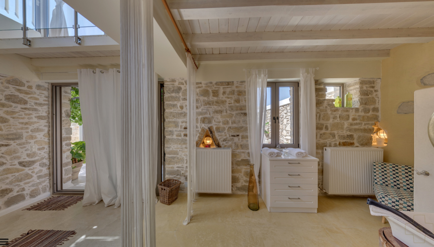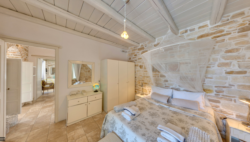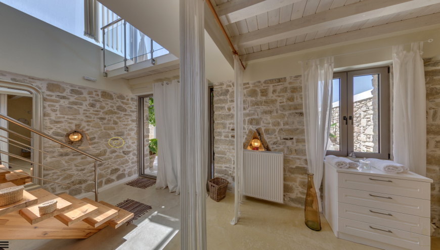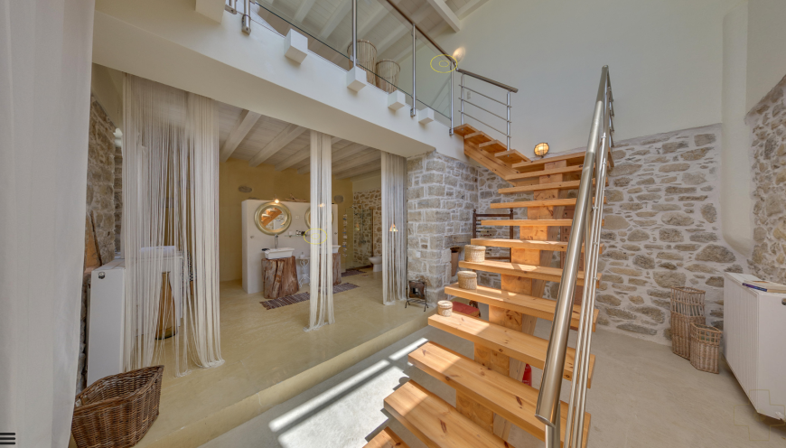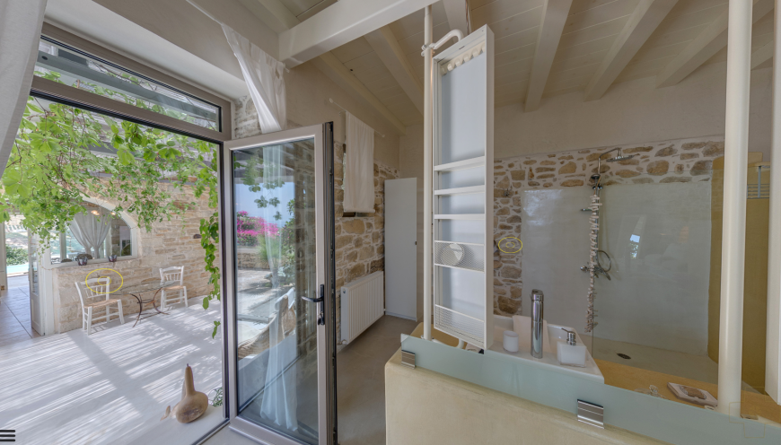 The four unique bedrooms, each with a separate entrance, provide an unobstructed and fascinating view of the glistening nearby sea. Three en-suite shower bathrooms, two with bidet, and a bathroom with bathtub, washing machine, dryer, ironing board, give the house a special touch.