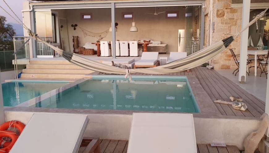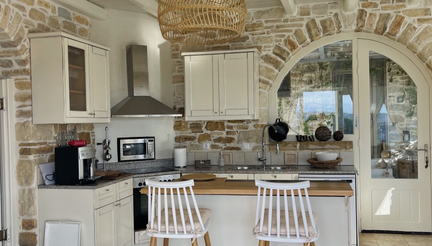 Villa Thea, built in 2013, is located above Pitsidia on a hilltop, the view sweeps over the roofs of Pitsidia to the brilliant sea, fantastic sunsets are granted. Located behind a natural stone wall, hidden from view, the path leads to the villa, past the ornamental garden with a fireplace, wood stove and barbecue, also a lounge area, up a large staircase. Here you meet the incredibly beautiful view of nature and mountains and the view of the house in reality.