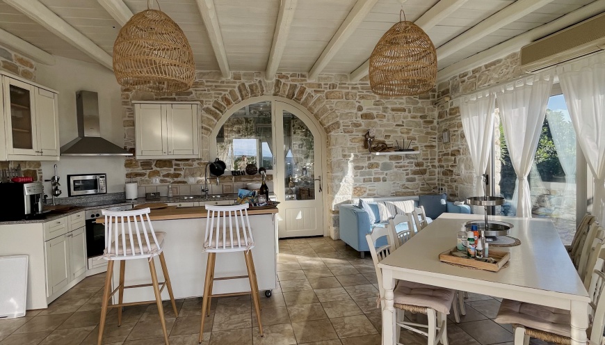 The open bright eat-in kitchen is equipped with every comfort. At the large dining table you can find enough space for up to 8 people and can enjoy the far-reaching view of the sea.